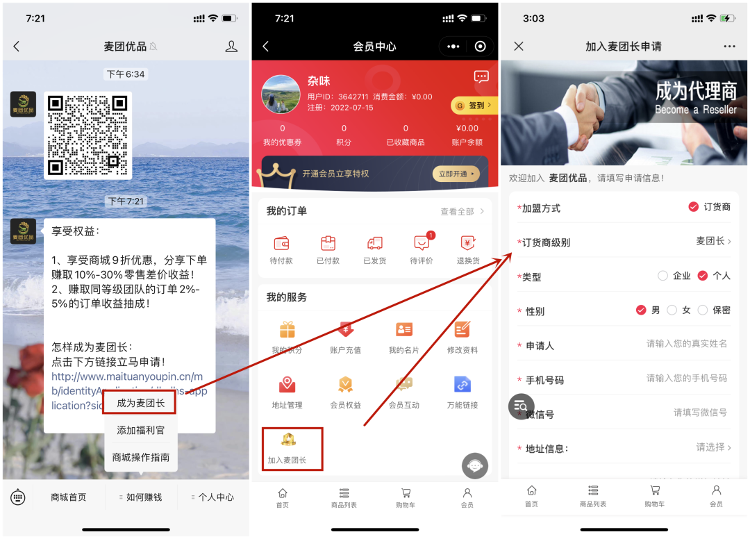 成為麥團長,可享受的權(quán)益有:①.小程序商城內(nèi)所有商品9折優(yōu)惠,分享下單賺取10%-30%零售差價收益;②.可以賺取同等級團隊的訂單2%-5%的訂單收益抽成!