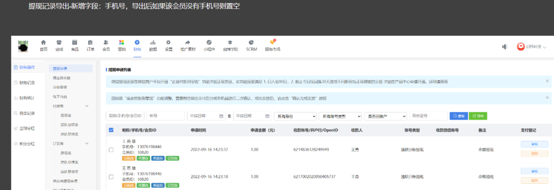 2、提現記錄導出新增手機號【新增】;