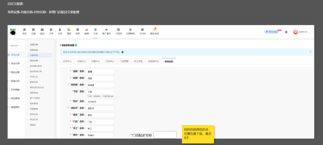 后臺自定義配置位置:系統設置-功能名稱-其他名稱:新增門店配送文案配置。