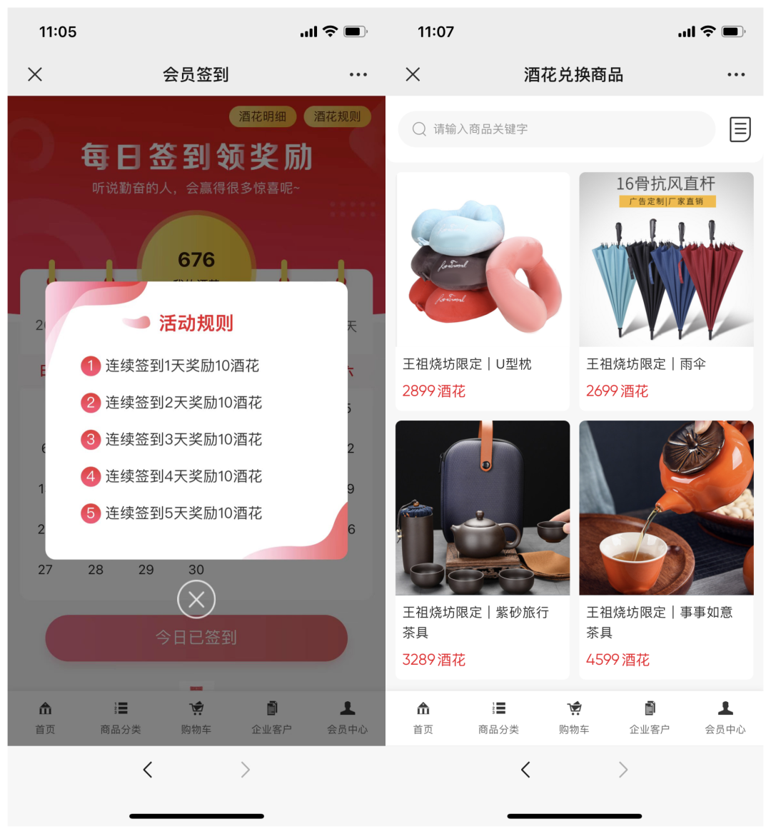 在白酒商品之外,王祖燒坊把低客單、復購高的生活用品:如U型枕、雨傘等引入到線上商城,再通過上線簽到打卡、蘿卜精靈游戲、下單贈酒花(積分)等營銷玩法,提升客戶的進店頻次,同時酒花(積分)還能兌換該類商品。