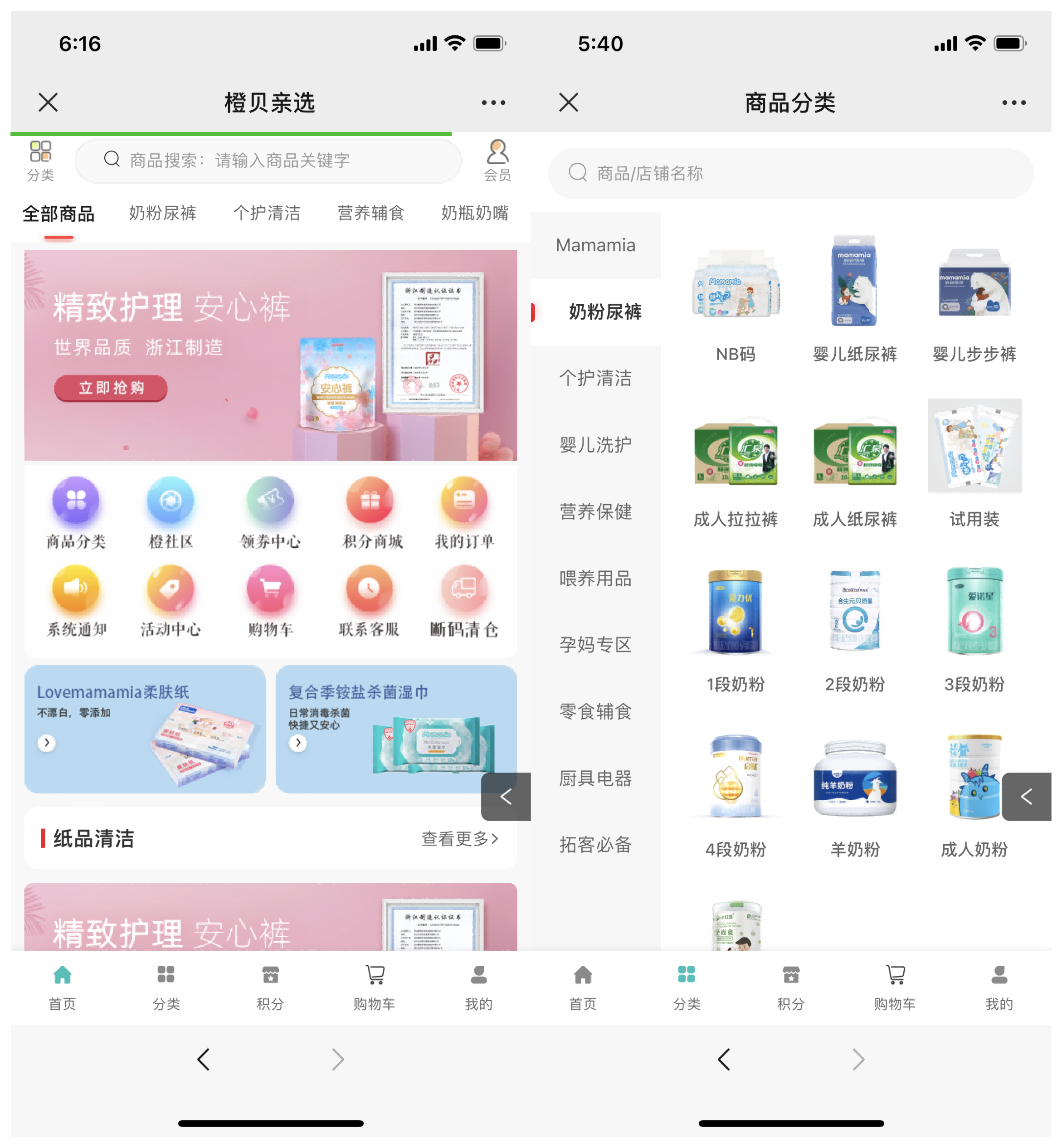 橙貝親選合作啟博微分銷系統,搭建了微商城和小程序商城,一店雙核商城分布由“首頁”、“分類”、“積分”、“購物車”、“我的”五大模塊構成。